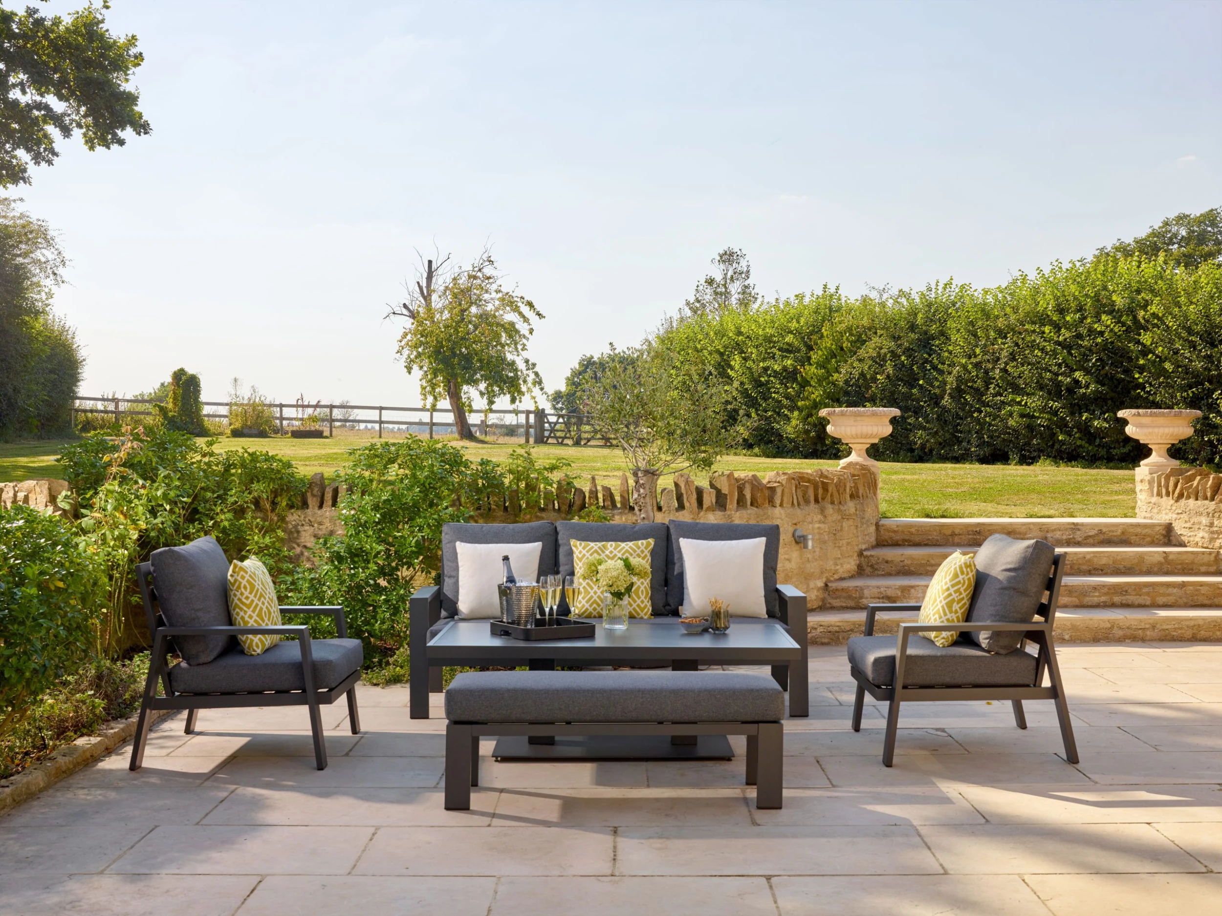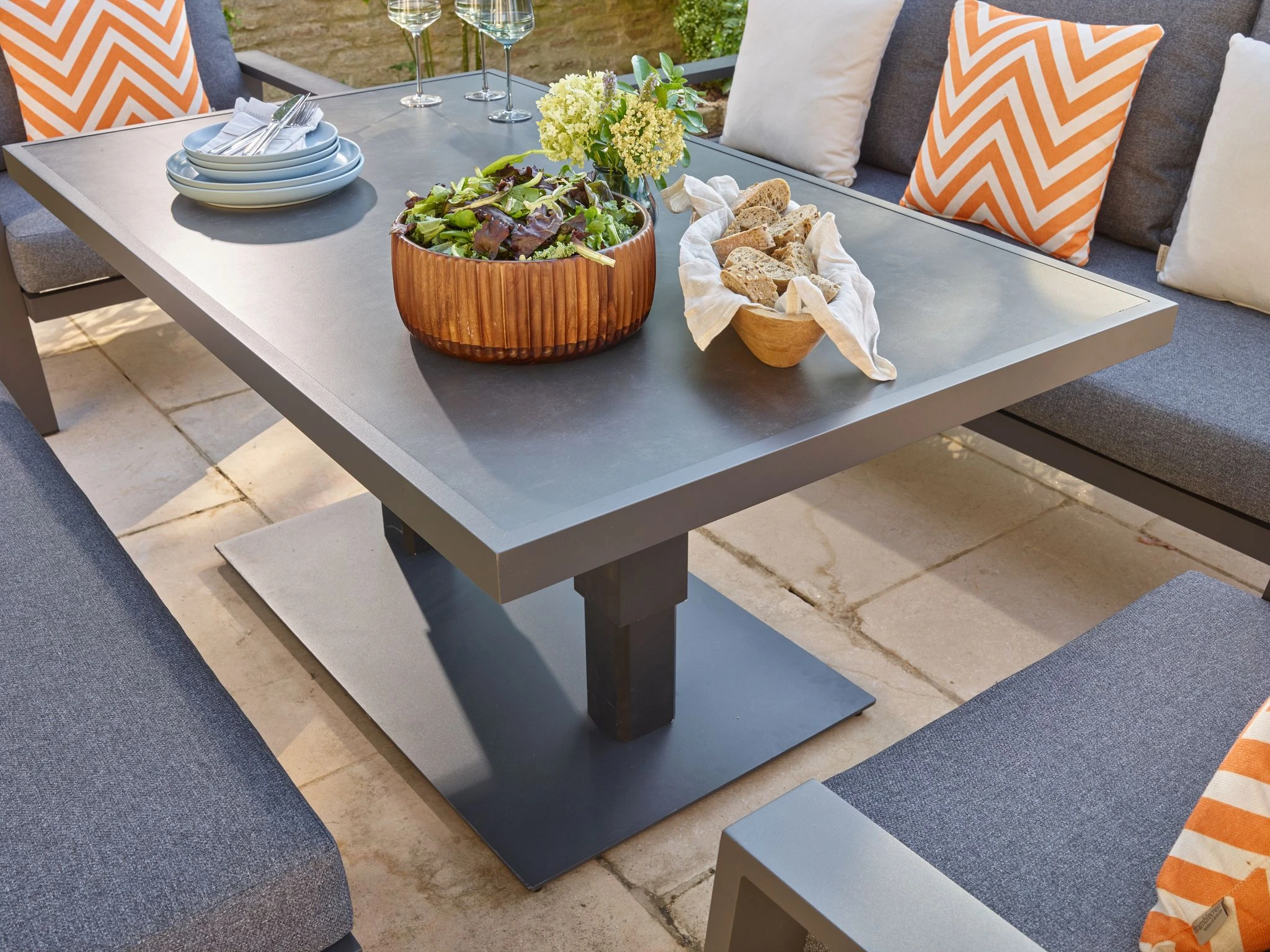 – Season-proof, UV-resistant Eco cushions in Slate made from recycled plastic bottles