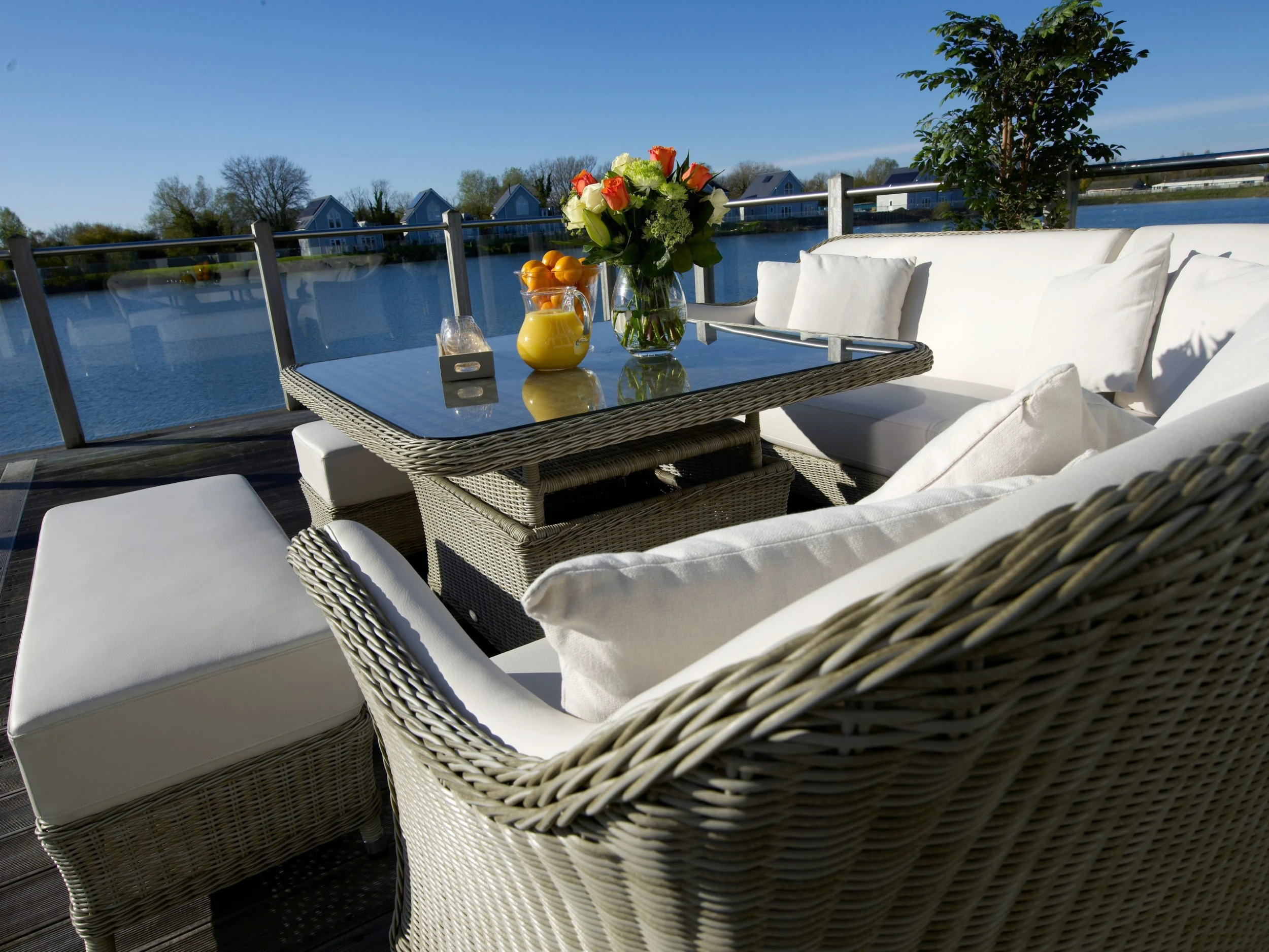 Enjoy a touch of super-yacht chic with our San Marie collection. Featuring luxurious faux-leather fabric, which is fully upholstered to the rattan, so no loose cushions are required. Made with a rust-free aluminium frame, the chairs are lightweight, durable and blissfully comfortable. The glass table top is recessed into the weave for added protection and aesthetics.