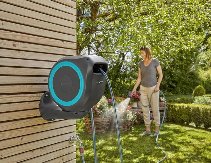 The Wall-Mounted Hose Box RollUp S comes with a wall bracket, a 15-metre irrigation hose, a flexible connection hose, all necessary Original GARDENA System Parts and a sprayer with two different spray jet options.