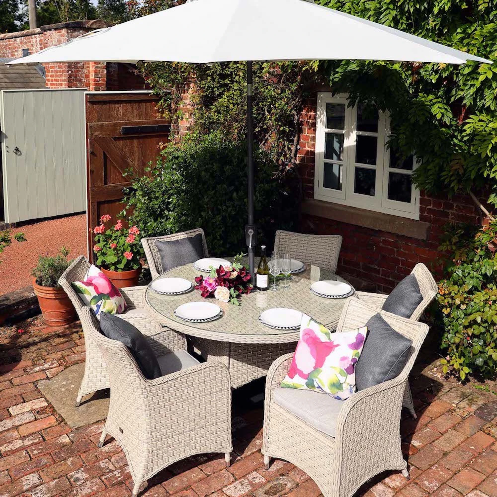 The Turin 6 Seat Round Dining Set is perfect for al fresco dining with your family and friends! The comfortable cushions are combined with curved armchairs creating the most luxurious dining experience. The covers for the cushions can be easily removed for easy cleaning!